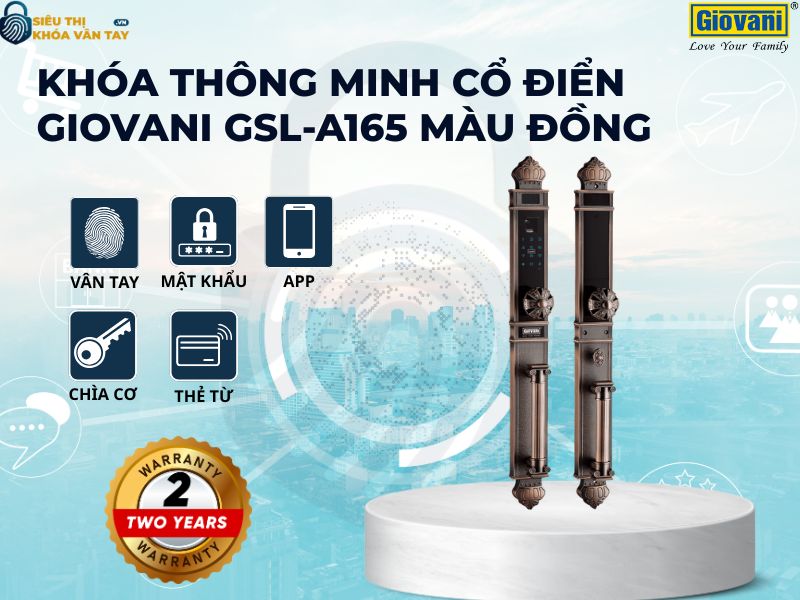 Khóa thông minh cổ điển Giovani GSL-A165 màu đồng không chỉ là thiết bị bảo vệ an toàn mà còn là điểm nhấn kiến trúc, nâng tầm đẳng cấp cho ngôi nhà. Với thiết kế tinh tế và công nghệ tiên tiến, sản phẩm xứng đáng là lựa chọn hàng đầu cho những ai yêu thích phong cách cổ điển sang trọng.