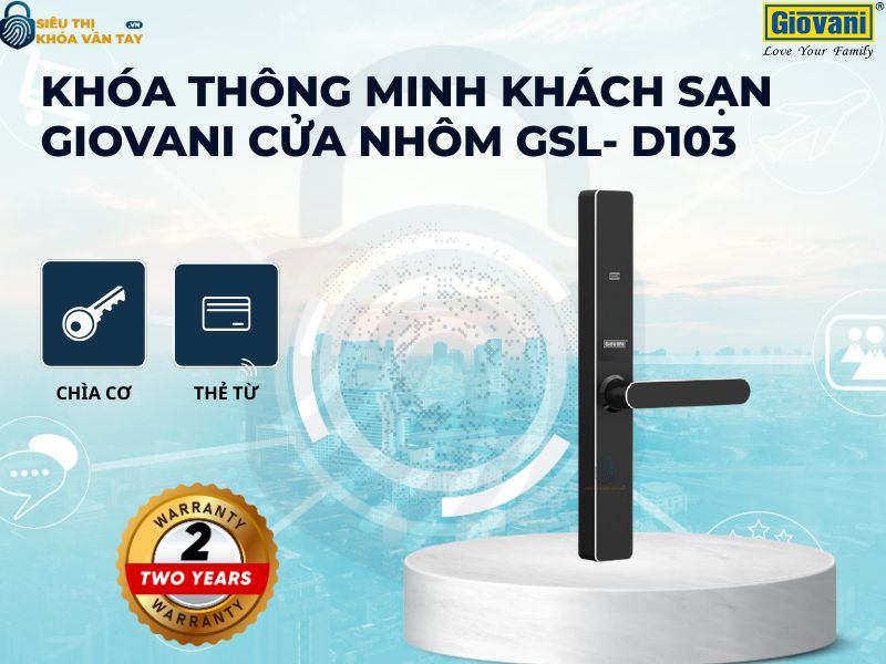 Trong số các dòng sản phẩm nổi bật, Khóa thông minh khách sạn Giovani cửa nhôm GSL-D103 được đánh giá cao nhờ thiết kế sang trọng, tính năng bảo mật đa dạng và khả năng quản lý khoa học. Đây là lựa chọn lý tưởng cho các khách sạn, resort, homestay hoặc căn hộ dịch vụ muốn nâng cấp chất lượng dịch vụ và gia tăng sự hài lòng của khách hàng.
