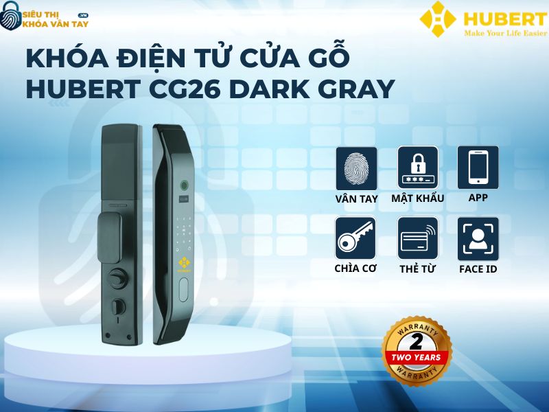 Khóa vân tay cửa gỗ Hubert CG26 Dark Gray là sự lựa chọn hoàn hảo cho không gian sống hiện đại, giúp gia đình bạn an toàn hơn với công nghệ Face ID 3D, camera giám sát và quản lý thông minh qua App WISHOME. Sản phẩm không chỉ tiện lợi, thẩm mỹ mà còn bền bỉ, phù hợp với khí hậu Việt Nam. Liên hệ ngay với Siêu Thị Khóa Vân Tay để sở hữu sản phẩm chính hãng và nhận nhiều ưu đãi hấp dẫn!