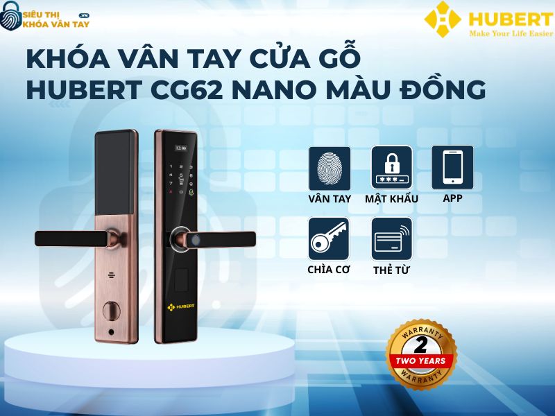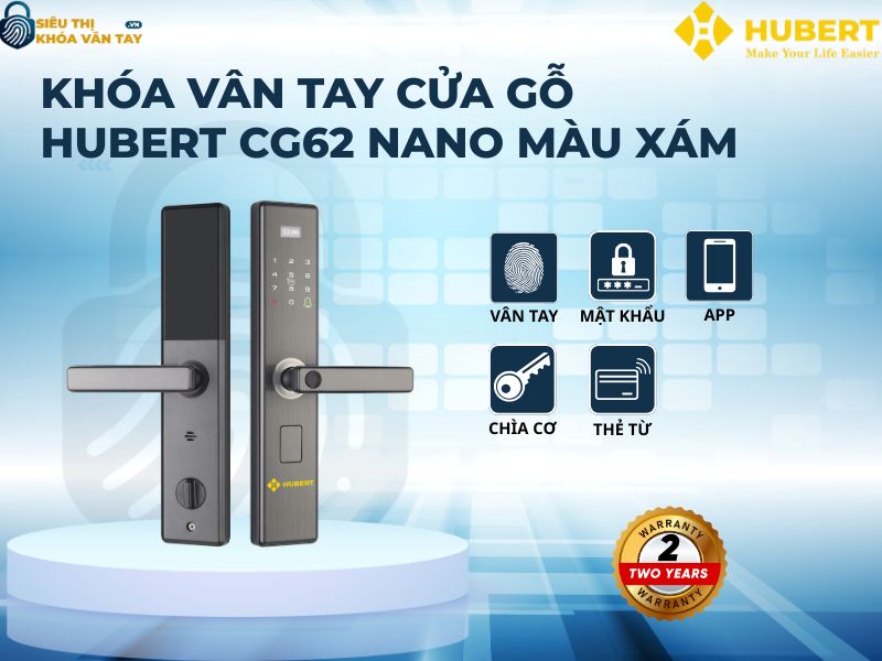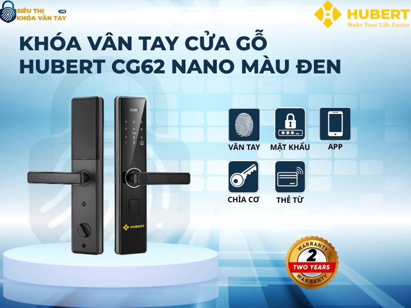 Khóa vân tay cửa gỗ Hubert CG62 NANO là lựa chọn lý tưởng cho ngôi nhà hiện đại, vừa an toàn vừa tiện lợi. Liên hệ Siêu thị Khóa Vân Tay để được lắp đặt nhanh chóng và hưởng chính sách bảo hành uy tín.