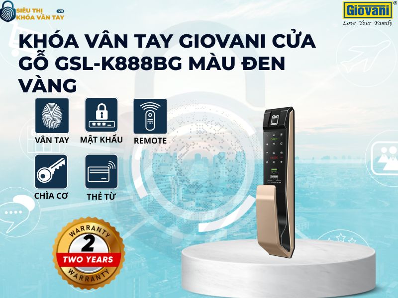 Khóa vân tay Giovani cửa gỗ GSL-K888BG màu đen vàng là sự kết hợp hoàn hảo giữa công nghệ hiện đại, độ bền vượt trội và tính thẩm mỹ sang trọng. Liên hệ ngay với Siêu Thị Khóa Vân Tay để được tư vấn chi tiết và nhận báo giá ưu đãi nhất cho công trình của bạn.