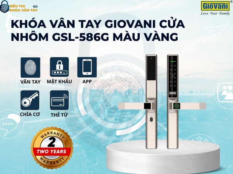 Khóa vân tay Giovani cửa nhôm GSL-586G màu vàng là lựa chọn hoàn hảo cho những ai mong muốn sự an toàn, tiện lợi và sang trọng. Liên hệ ngay với Siêu Thị Khóa Vân Tay để được tư vấn chi tiết và nhận báo giá ưu đãi nhất cho công trình của bạn.